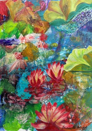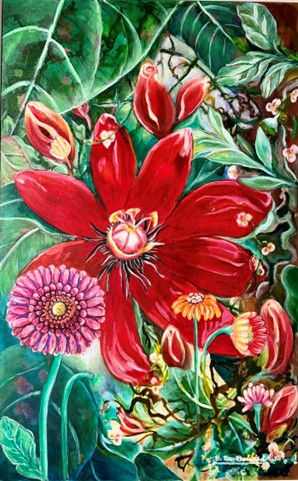 My process is intuitive and layered. I build textures and colors gradually, allowing the painting to evolve much like a garden. Bright tropical hues—crimson, magenta, turquoise, and gold—reflect the warmth and vitality of island life while expressing emotional depth.