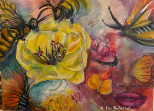 Many of my works center on the female figure surrounded by flourishing gardens of color. Flowers bloom from hair, butterflies hover near closed eyes, and birds rest among petals. These images represent the inner landscape of the self—thoughts, emotions, memories, and quiet transformations that take place beneath the surface. The women in my paintings often appear in moments of stillness or contemplation, suggesting a connection between inner peace and the rhythms of nature.